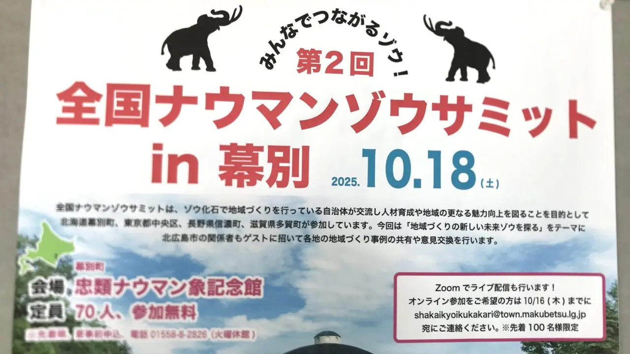 2025年10月18日(土)、「みんなでつながるゾウ! 第2回全国ナウマンゾウサミットin幕別」が開催されます。会場は忠類ナウマン象記念館です。