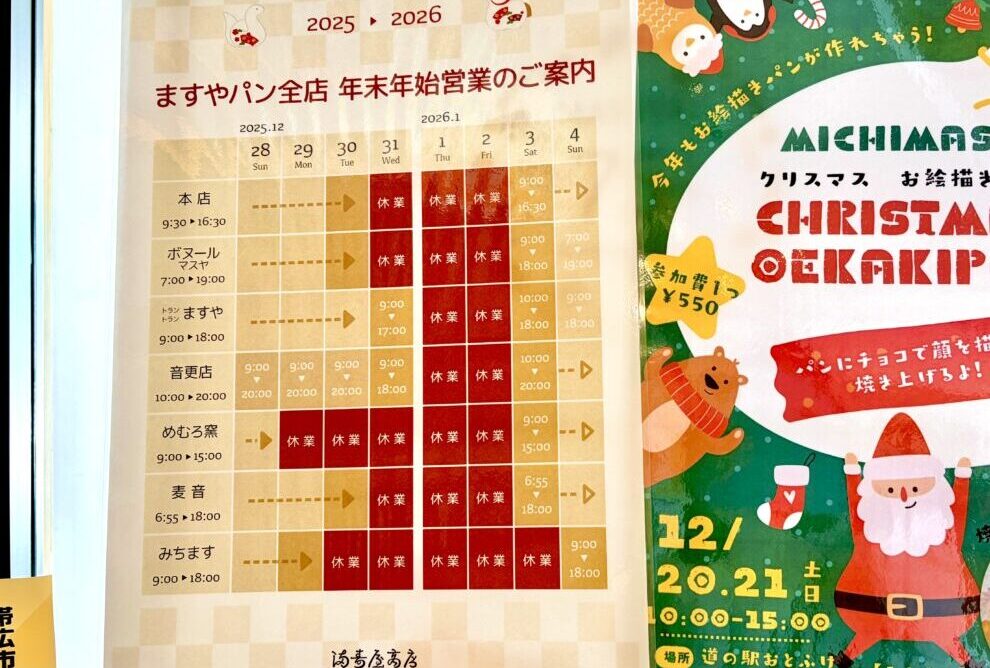 ますやパン全店舗2026年1月1日(木・元日)と1月2日(金)は休業。詳細は下記の写真または満寿屋商店公式サイト等ををご確認ください。