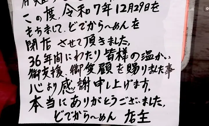 創業36年の人気ラーメン店が2025年12月29日(月)をもって閉店してしまいました。多くの情報提供もいただき、「とてもショックです・・・」という閉店を惜しむ声も寄せられています。