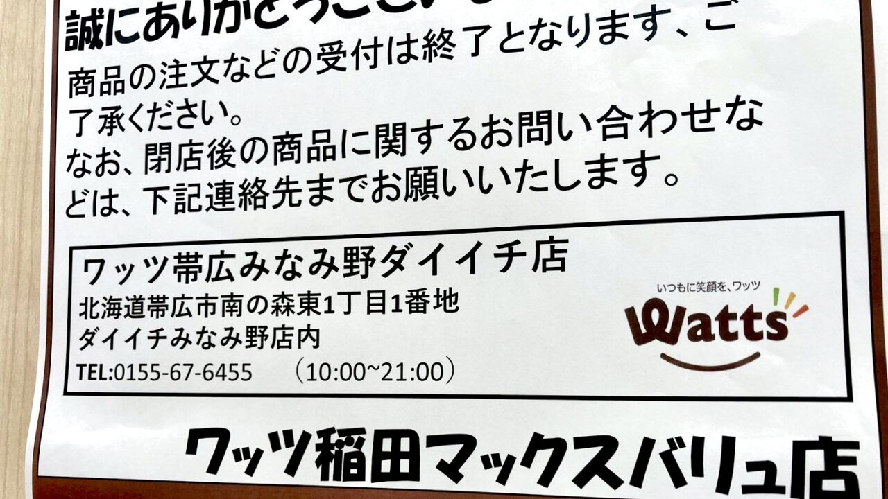 「ワッツ稲田マックスバリュ店」は2026年2月28日(土)まで営業。最寄りの店舗は、「ワッツ稲田マックスバリュ店」から車で3分ほどの「ワッツウィズ 帯広WOW店」(北海道帯広市西4条南29丁目1ー8 WOW帯広1階)や、車で6分ほどの「ワッツ 帯広みなみ野ダイイチ店」(北海道帯広市南の森東1丁目 ダイイチみなみ野店内)が営業中です。閉店後の商品に関するお問合せは「ワッツ 帯広みなみ野ダイイチ店」。