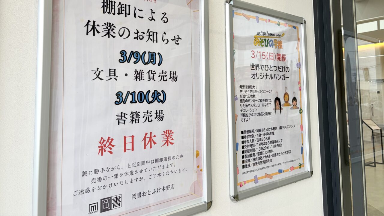 岡書 おとふけ木野店公式Instagramには、【部分休業のお知らせ】と題し、3月9日(月)は文具・雑貨・アクセサリー売場が終日休業、3月10日(火)は書籍売場が終日休業する旨、投稿されています。